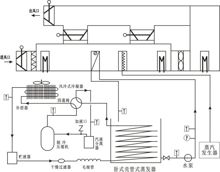 綜合性;采用國內(nèi)先進(jìn)的二次回風(fēng)系統(tǒng),在同一臺(tái)實(shí)驗(yàn)臺(tái)上完整的完成8種制冷系統(tǒng)工況