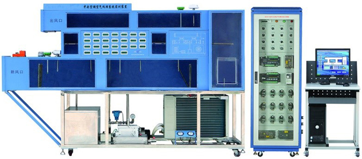 中央空調(diào)系統(tǒng)由實(shí)驗(yàn)臺(tái)、制冷機(jī)組、制熱系統(tǒng)、加濕裝置、空調(diào)箱(風(fēng)道)、冷凍水系統(tǒng)、測量儀表(包括溫濕度傳感器及風(fēng)速傳感器)、電氣控制系統(tǒng)、模擬熱源等組成。