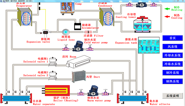 (2)、是系統(tǒng)動畫演示:如壓縮機系統(tǒng)、制冷系統(tǒng)、制熱系統(tǒng)、風(fēng)系統(tǒng)、集中送風(fēng)系統(tǒng)、半集中送風(fēng)系統(tǒng)的原理過程。