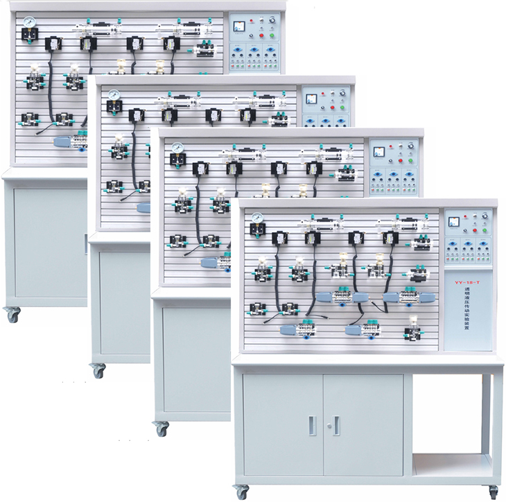 透明液壓實(shí)驗(yàn)臺(tái)為實(shí)現(xiàn)液壓傳動(dòng)課程現(xiàn)代化教學(xué)而進(jìn)行研究的最新科技成果,它填補(bǔ)了技校、中專、大專院校的液壓傳動(dòng)透明教學(xué)設(shè)備的國家空白。液壓傳動(dòng)具有重量輕、功率大、結(jié)構(gòu)簡單、布局靈活、控制方便等特點(diǎn)、速度、扭矩、功率均可作無級(jí)調(diào)節(jié),能迅速換向和變速,調(diào)速范圍寬,快速性好,工作平穩(wěn)、噪音小,元器件已實(shí)現(xiàn)系列化、標(biāo)準(zhǔn)化,通用化等一系列優(yōu)點(diǎn),隨著科學(xué)技術(shù)的發(fā)展,液壓傳動(dòng)作為一種可以傳遞動(dòng)力和控制的傳動(dòng)方式,已經(jīng)日益廣泛應(yīng)用到醫(yī)療、科技、軍事、工業(yè)自動(dòng)化生產(chǎn)、起動(dòng)、運(yùn)輸、礦山、建筑、航空等各個(gè)領(lǐng)域。為了適應(yīng)在短暫課堂時(shí)間內(nèi),完成多個(gè)液壓油路的教學(xué)內(nèi)容。同時(shí)對(duì)比演示多個(gè)不同油路的工作原理。而且,使油路系統(tǒng)的安裝調(diào)試有必要的程序且不占用上課教學(xué)時(shí)間。就必須有多臺(tái)設(shè)備同時(shí)工作。同時(shí),YY-18