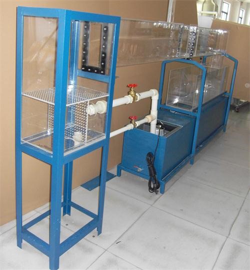 主要配置:實驗工作槽,三角量水堰、回水蓄水槽、供水段穩(wěn)水頭部、多種實驗?zāi)P、測量儀器、供水泵、流量調(diào)節(jié)裝置等組成,空間三疊層緊縮布置。