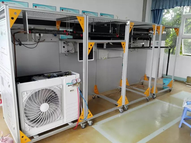 實(shí)訓(xùn)裝置采用移動(dòng)框架4040鋁型材結(jié)構(gòu),安裝好后可固定位置,防止移動(dòng)而牽動(dòng)制冷系統(tǒng)管路。整個(gè)模擬房頂采用1.5MM的網(wǎng)多功能網(wǎng)孔板設(shè)計(jì)使用專(zhuān)業(yè)家用中央空調(diào)專(zhuān)用吊架。掛壁式后安裝板同樣也采用的網(wǎng)多功能網(wǎng)孔板設(shè)計(jì).