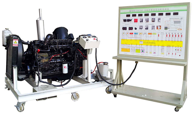 柴油發(fā)動機總成、組合儀表、發(fā)動機控制單元、散熱系統(tǒng)(水箱、風扇、上下水管)、排氣系統(tǒng)、進氣系統(tǒng)(進氣軟管、空氣濾清器總成)、原車電路原理圖板及檢測端子面板、蓄電池、電源總開關、燃油箱、油水分離器、油門踏板裝置、可移動機臺架、臺架高溫及轉動等部位加裝防護裝置等。
