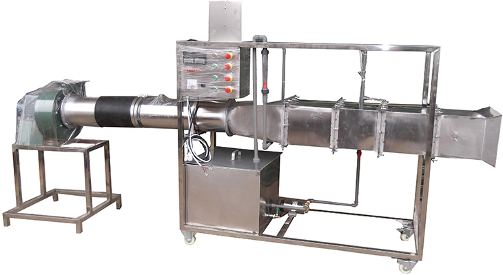 循環(huán)防腐水泵,轉(zhuǎn)子流量計(jì)、風(fēng)冷冷凝器,翅片管式換熱器,風(fēng)洞實(shí)驗(yàn)段,多翼式低噪音離心風(fēng)機(jī),自動(dòng)調(diào)節(jié)風(fēng)門,笛形管及差壓測風(fēng)速裝置,加熱由固體調(diào)壓模塊無級調(diào)節(jié),控制測試儀表箱,不銹鋼加熱水箱,8路萬能信號輸入巡檢儀顯示溫度、水和風(fēng)的阻力及風(fēng)速。
